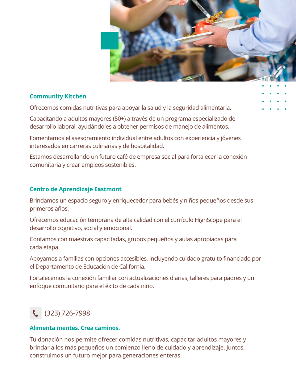 Eastmont Community Center ofrece clases de nutrición, asesoramiento y talleres financieros y para la preparación de impuestos. También asistimos con otros temas de interés para nuestra comunidad en East LA.